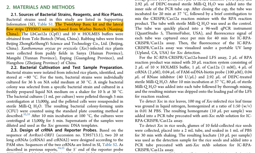 水稻細(xì)菌性條斑?。˙LS)作為由Xanthomonas oryzae pv. oryzicola(Xoc)引發(fā)的毀滅性病害,每年給全球水稻產(chǎn)業(yè)造成巨額產(chǎn)量損失,更是我國重點(diǎn)防控的檢疫性病害。傳統(tǒng)檢測(cè)技術(shù)始終存在諸多瓶頸:癥狀觀察與形態(tài)鑒定準(zhǔn)確率偏低,PCR技術(shù)依賴昂貴設(shè)備難以現(xiàn)場(chǎng)應(yīng)用,等溫?cái)U(kuò)增易出現(xiàn)假陽性,血清學(xué)方法靈敏度不足,核酸提取過程還易受干擾。針對(duì)這些痛點(diǎn),一項(xiàng)發(fā)表于《Agricultural and Food Chemistry》的研究,創(chuàng)新開發(fā)出IC-RPA-CRISPR/Cas12a檢測(cè)方法,為水稻細(xì)菌性條斑病的精準(zhǔn)防控提供了全新解決方案。其中,研究中的CRISPR/Cas12a部分使用的正是我司提供的JY0301 CRISPR Cas12/13 HybriDetect試紙條。